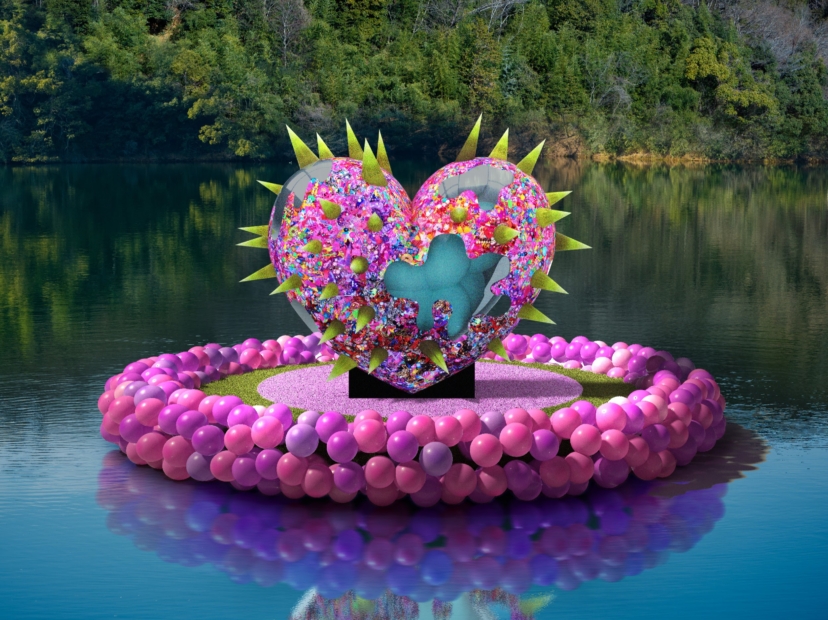 ②「棘で守られたハート」の巨大なアート作品、ピンクの島が宮沢湖に出現